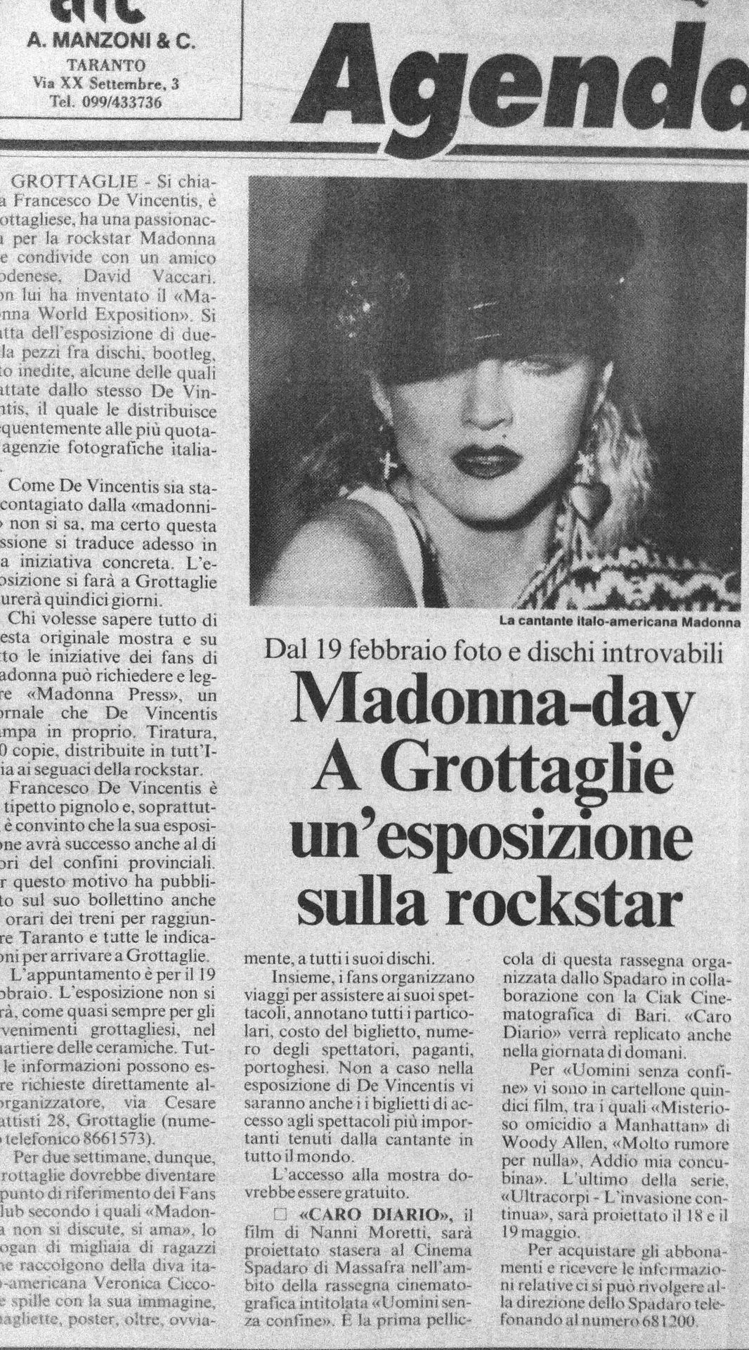 L’iniziativa porta la firma di Francesco De Vincentis, collezionista e appassionato grottagliese che da anni condivide la sua passione con altri fan internazionali, attraverso il network “Madonna World Exposition”.